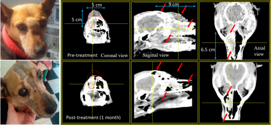 Two to three portals per BNCT application were used to achieve a potentially therapeutic dose over the tumor without exceeding normal tissue tolerance. Clinical and Computed Tomography results evidenced partial tumor control in all cases, with slight-moderate mucositis, excellent life quality, and prolongation in the survival time estimated at recruitment. These exploratory studies show the potential value of BNCT in veterinary medicine and contribute towards initiating a clinical BNCT trial for head and neck cancer at the RA-6 clinical facility.