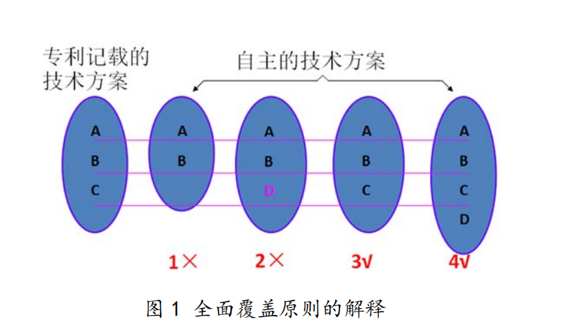 全面覆蓋原則,是指他人專利的所有權(quán)利要求中記載的技術(shù)方案拆解成相應(yīng)技術(shù)特征,將這些技術(shù)特征逐一地與自主技術(shù)方案對(duì)應(yīng)的構(gòu)件進(jìn)行比較,去判斷每個(gè)構(gòu)件與技術(shù)特征之間的異同,俗稱 CC 表(Claim Chart,技術(shù)特征比對(duì)表)。參見(jiàn)圖 1,當(dāng)自主的技術(shù)方案缺少專利記載的技術(shù)方案中的1個(gè)或多個(gè)技術(shù)特征或者至少1個(gè)技術(shù)特征不相同時(shí),則根據(jù)全面覆蓋原則, 自主的技術(shù)方案不落入專利的保護(hù)范圍內(nèi);相反,技術(shù)特征完全相同或者比專利記載的技術(shù)特征更多時(shí),則自主的技術(shù)方案落入專利的保護(hù)范圍內(nèi),構(gòu)成侵權(quán)。