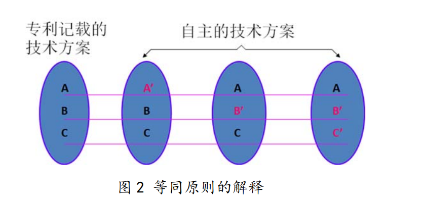 所謂等同原則,當(dāng)有一些技術(shù)特征與構(gòu)件之間的比較不滿足技術(shù)特征記載的字面文義時(shí),那么就需要考慮是否適用等同原則,技術(shù)特征與構(gòu)件之間的比較,是否符合“三基本一普通”的判斷標(biāo)準(zhǔn),即該構(gòu)件與技術(shù)特征相比,是否以基本相同的手段,實(shí)現(xiàn)基本相同的功能,達(dá)到基本相同的效果,并且本領(lǐng)域普通技術(shù)人員在被訴侵權(quán)行為發(fā)生時(shí)無(wú)需經(jīng)過(guò)創(chuàng)造性勞動(dòng)就能夠聯(lián)想到的特征。參見(jiàn)圖2,當(dāng)至少一個(gè)構(gòu)件與權(quán)利要求對(duì)應(yīng)的技術(shù)特征不相同時(shí),則根據(jù)上述的判斷標(biāo)準(zhǔn),將 A 和 A’、B 和 B’、C 和 C’進(jìn)行比較,來(lái)判斷是否構(gòu)成等同。