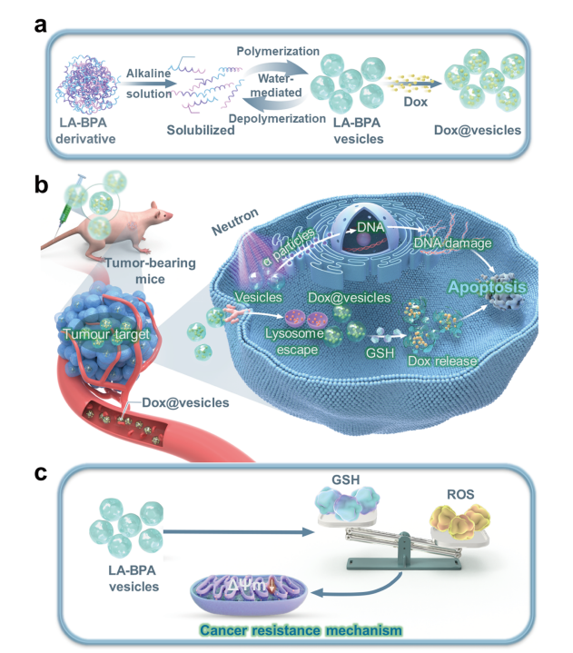 硫辛酸、短鏈PEG、BPA三種片段的有序組裝,形成具有pH依賴可逆自組裝納米囊泡的小分子化合物。在pH弱酸性條件下制備的納米囊泡,其表面的苯硼酸基團(tuán)賦予納米囊泡唾液酸靶向功能。囊泡內(nèi)富含的二硫鍵可通過消耗癌細(xì)胞內(nèi)的谷胱甘肽(GSH)打破細(xì)胞內(nèi)氧化還原平衡,誘導(dǎo)癌細(xì)胞凋亡。此外,該囊泡用于阿霉素(Dox)包載制備納米制劑時,有利于小分子藥物的在腫瘤部位的有效富集,GSH響應(yīng)釋放有利于藥物在腫瘤部位定點釋放,可降低化療的全身毒副作用,顯著提高抗腫瘤效果。