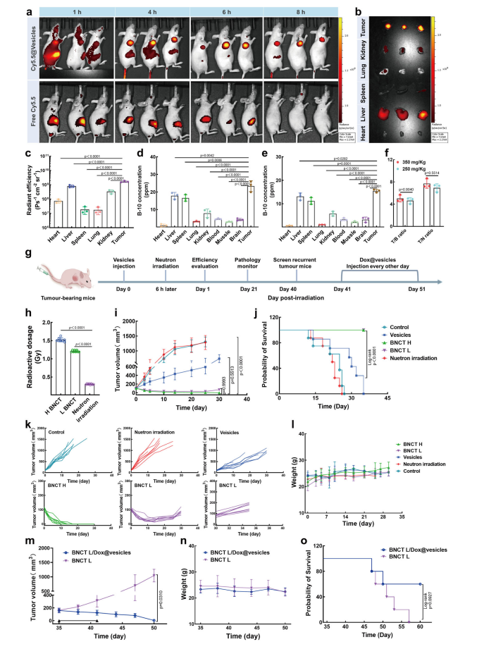 通過引入B-10同位素,LA-BPA衍生物囊泡能夠?qū)NCT與化療進(jìn)行有機(jī)結(jié)合,實現(xiàn)優(yōu)勢互補,顯著提高胰腺癌的治療效果。研究發(fā)現(xiàn),當(dāng)囊泡藥物劑量達(dá)到350mg/Kg時,可滿足BNCT治療需求,經(jīng)中子照射治療后,腫瘤實現(xiàn)完全抑制,未出現(xiàn)明顯的腫瘤復(fù)發(fā)、轉(zhuǎn)移等現(xiàn)象。此外,BNCT治療組在第35天的存活率均為100%,高于其他實驗組,這突出表明了LA-BPA衍生物囊泡作為含硼制劑用于腫瘤BNCT中的可能。